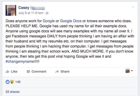 "Apakah ada di antara kalian yang bekerja untuk Google atau Google Docs atau tahu seseorang yang tahu soal ini, tolong bantu saya. Google menggunakan nama saya untuk semua contoh dokumen. Siapa pun yang menggunakan Google Docs akan melihat ada banyak contoh dokumen menggunakan nama saya.